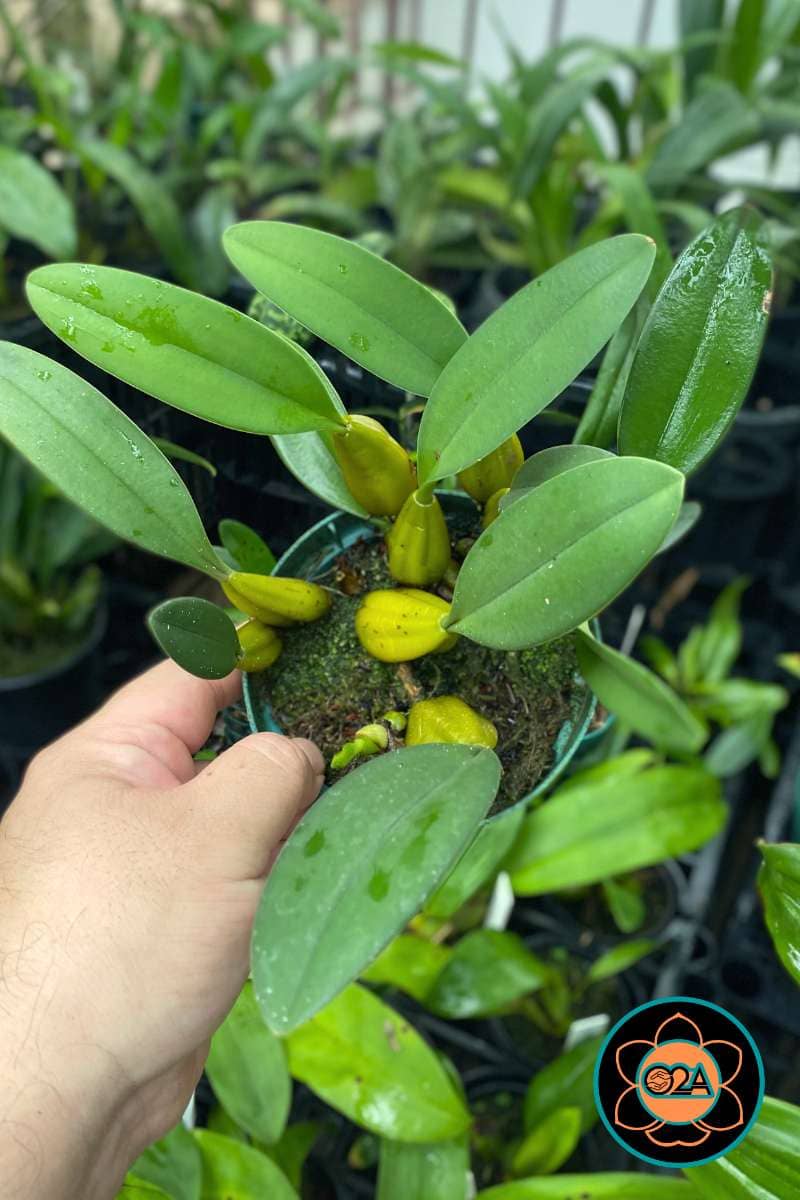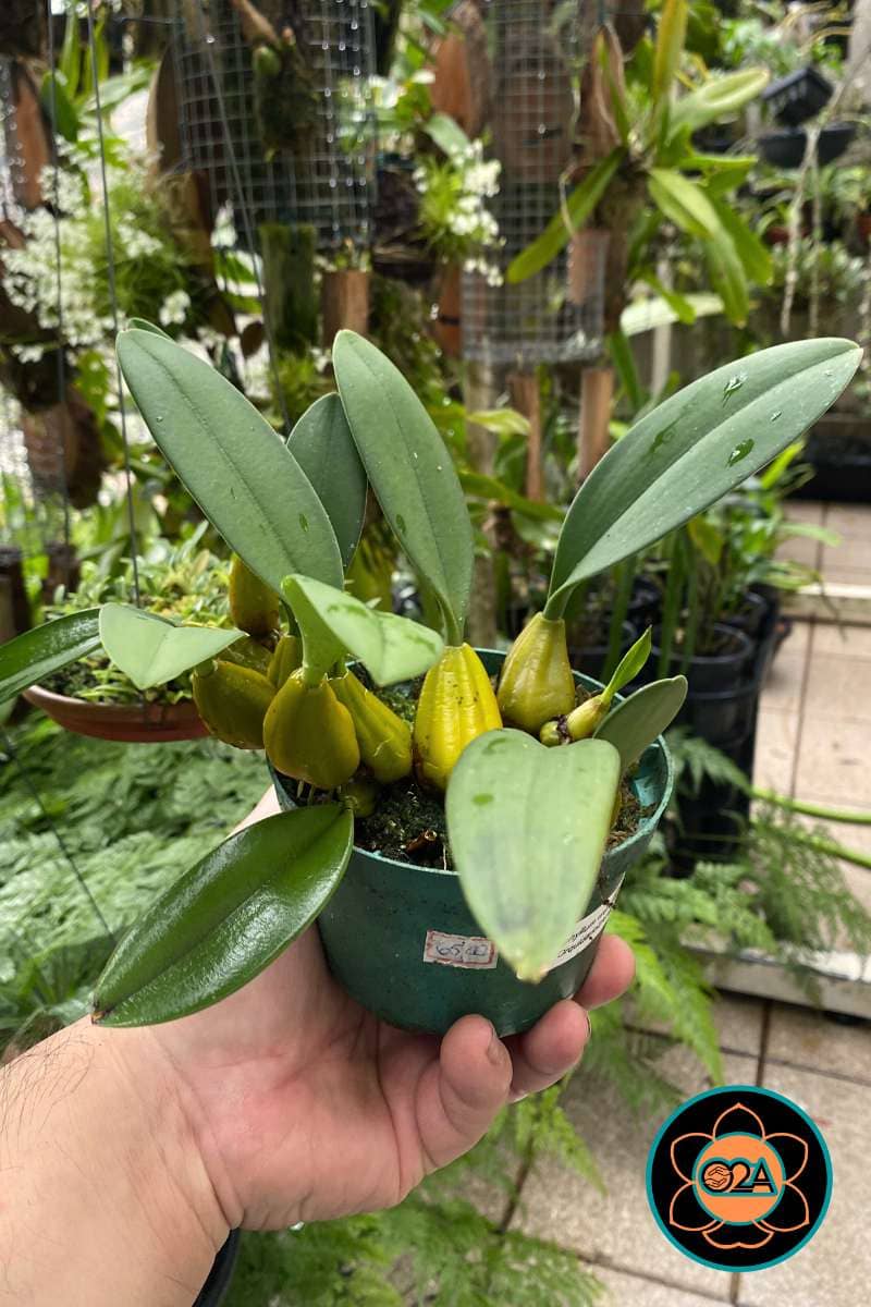 Tamanho da Flor: Grande e complexa, podendo atingir até 15 cm de comprimento total, com sépalas laterais fundidas e voltadas para baixo.