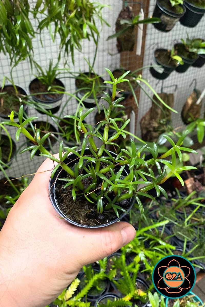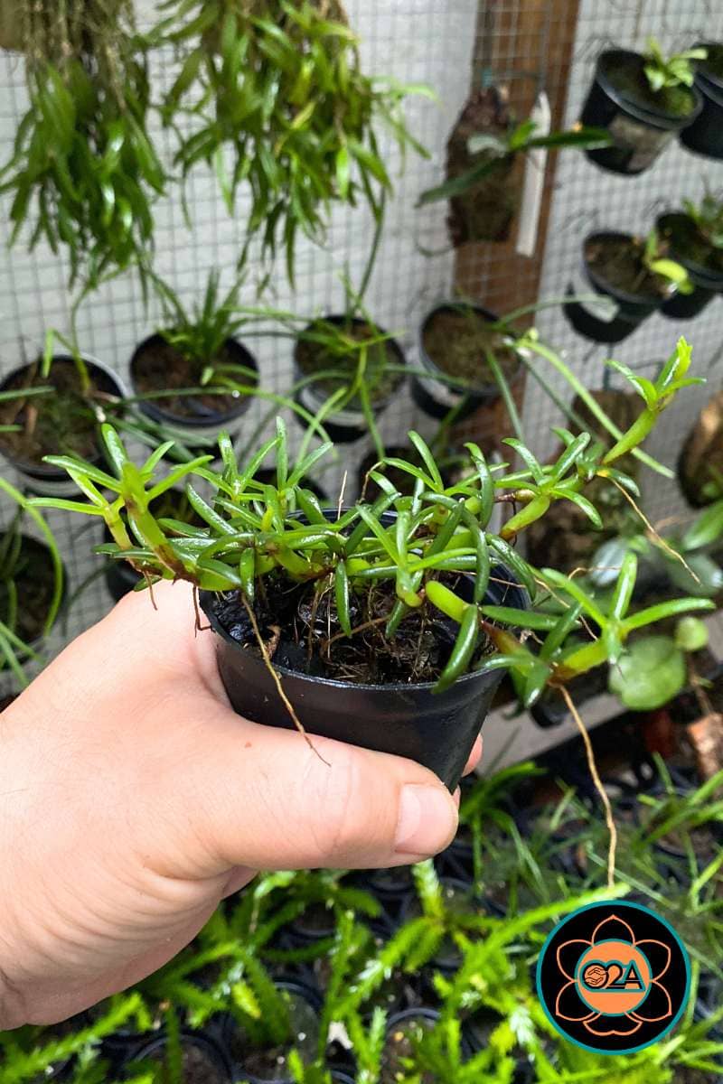 Porte da Planta: Mini-orquídea de hábito rasteiro e ramificado. Forma tapetes densos de pseudobulbos pequenos e suculentos, que lembram “miçangas” ou pequenas lâmpadas.
