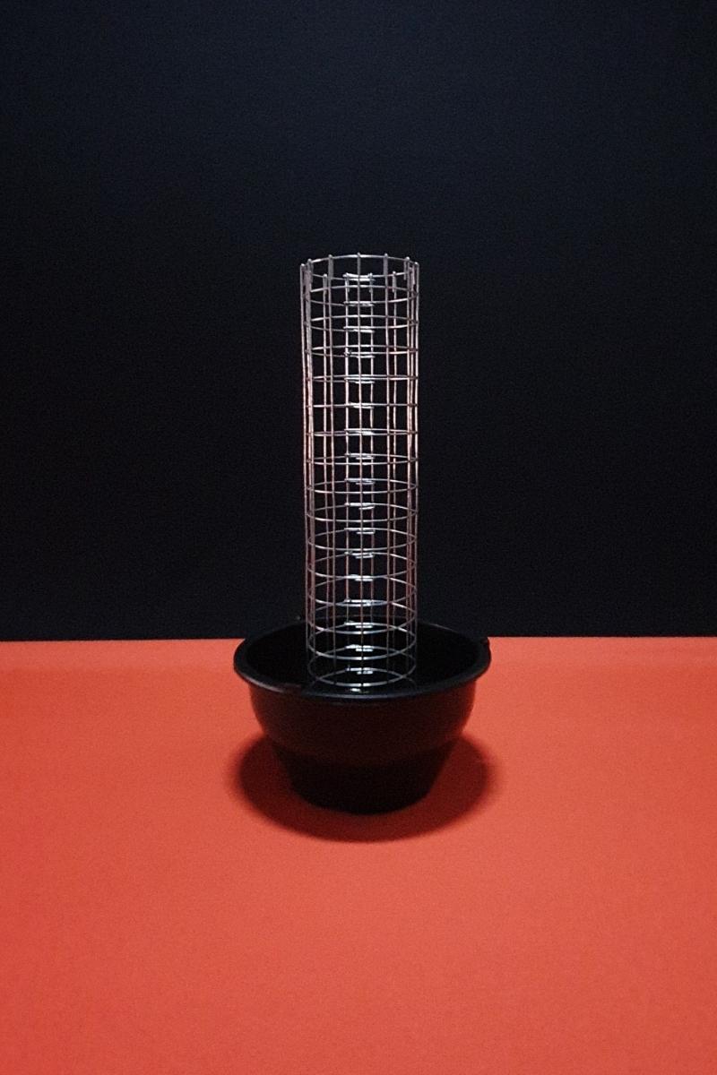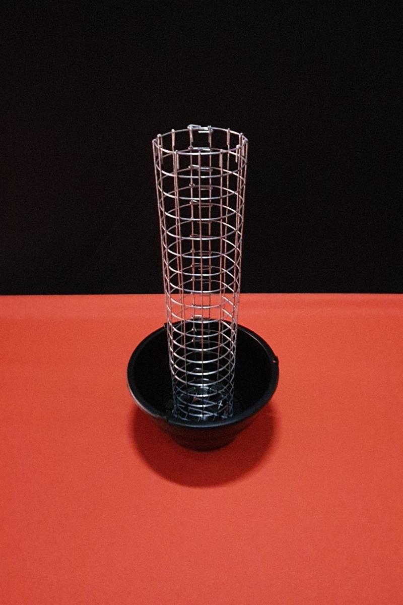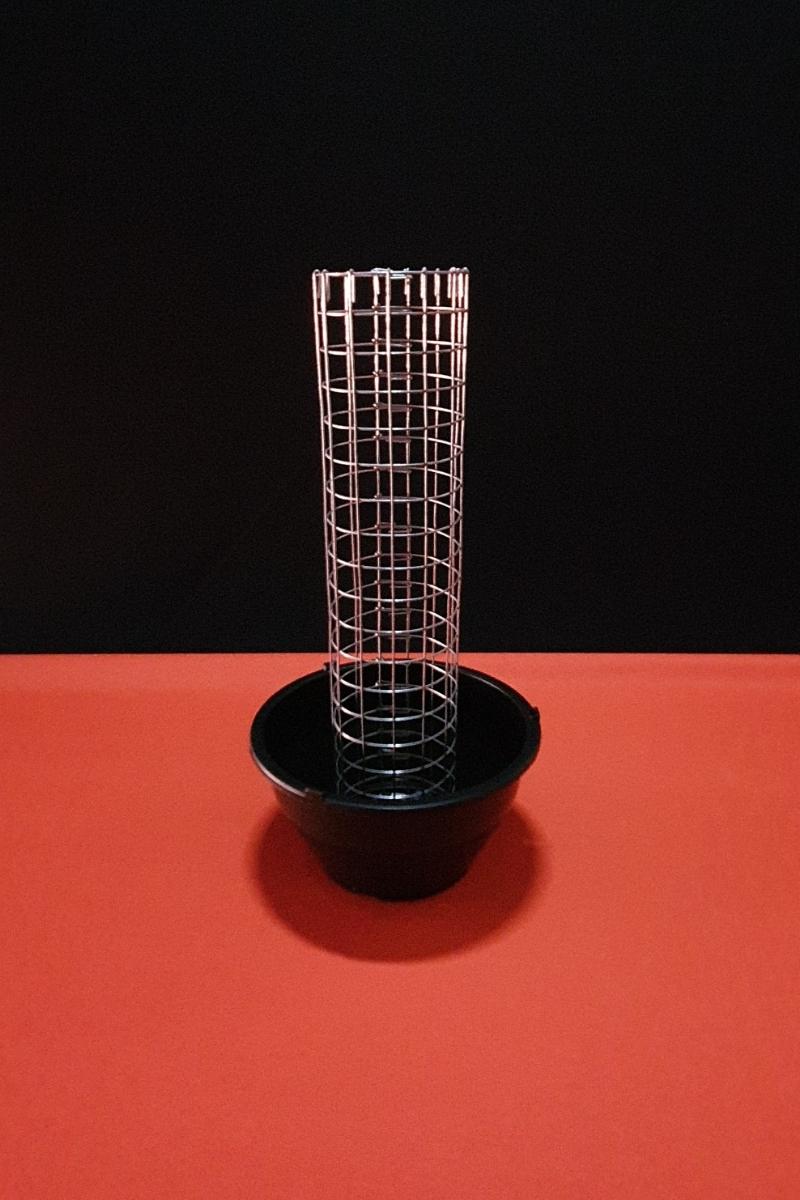 - Tubinho confeccionado em tela de arame galvanizado no tamanho de 5cm de diâmetro e 24cm de altura, acoplado a um vaso cuia 13.
